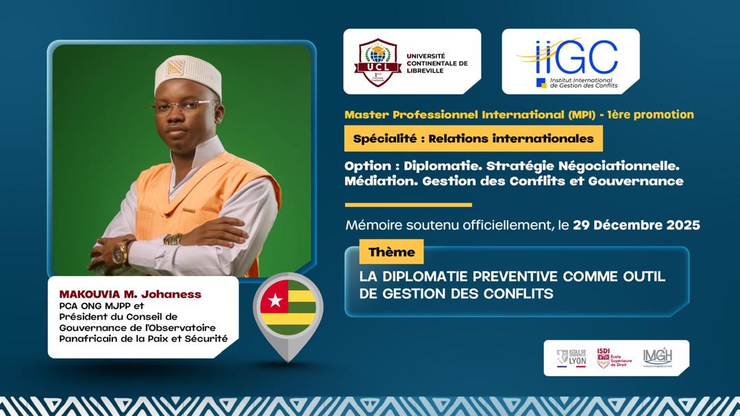 Le 29 décembre 2025, l’Ambassadeur Johaness MAKOUVIA a brillamment soutenu son mémoire de Master Professionnel International (MPI), en Relations internationales, avec une validation assortie de la mention Très Bien.